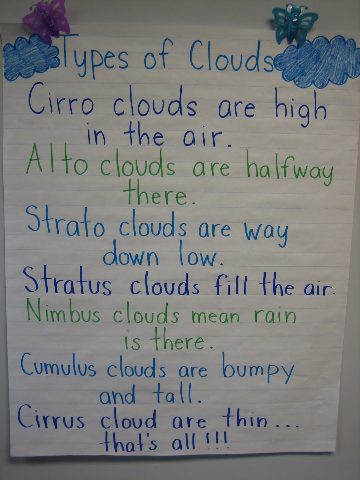 Today we started to talk about the different types of clouds. I found this really cute poem that I shared with the kids after we read the AMAZING Cloud book. The kids were amazed by all the different types of clouds. Today we copied down the poem then tomorrow we are going to use cotton balls to make the different types of clouds around our poem writing!